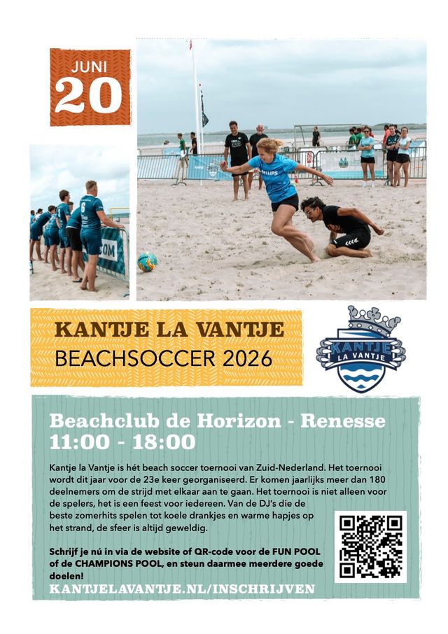 Am 20. Juni von 11:00 bis 18:00 Uhr findet Kantje la Vantje im Beachclub de Horizon in Renesse statt. Es ist das Beachsoccer-Turnier im Süden der Niederlande und wird in diesem Jahr bereits zum 23. Mal organisiert. Jedes Jahr treten mehr als 180 Teilnehmer gegeneinander an – unter dem Motto: Play and let play.