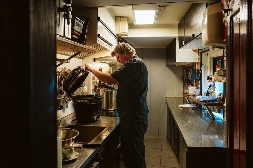 Toch is er veel houvast bij het koken. Evert bouwt het menu op rond de hoofdingrediënten, vlees, vis of groenten. “Ik ga hier dichtbij naar de boer met een groentewinkeltje op het erf. Kijken of er groenten zijn die daar goed bij passen. Een tijdje terug nog had ik bedacht dat het wel lekker zou zijn om spruiten te serveren met een beetje spek er rond. Toen zei de boerin: ‘Je weet waar ze staan, trek ze maar uit de grond.’”